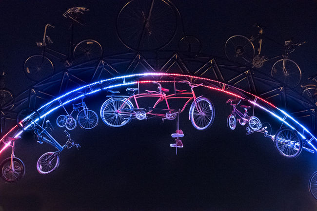 "Spokes" was installed in 2018 as a collaborative effort between Art Round Tennessee, local sculptor Brad Sells, the City of Cookeville, Stone Steel, and other members of the community. Spurred by Brad's vision of Spokes in 2016, Art Round Tennessee chose to embark on its first permanent and public art installation. Over the course of two years, Spokes was funded and planned by Art Round Tennessee in accordance with the city, while being created in Brad Sells' studio and then at Stone Steel by Brad and other local artists and artisans including Abraham Pardee, David Fricke and Anthony Ford. The sculpture — a 36-foot-wide, 14-foot-tall arch of bicycles — spans the bike path entrance of Putnam County's Tennessee Central Heritage Rail Trail. The location is accessible and easily visible in Cookeville's historic downtown district, the West Side. Most of the bicycles used in Spokes were donated by local residents.